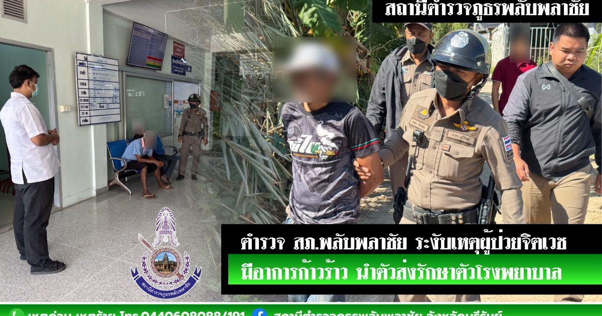 วันที่ 10 ธันวาคม 2567 เวลา 10.21 น. ร.ต.ท.บุญเทียม ปะกาเร รอง สว.(ป.) สภ.พลับพลาชัย ปฏิบัติหน้าที่ร้อยเวร 20 พร้อม พลับพลา 30 พร้อมผู้ช่วยเวร และสายตรวจรถจักรยานยนต์ได้ ระงับเหตุผู้ป่วยจิตเวช พบมีอาการก้าวร้าว บ้านบุญช่วย ต.สะเดา อ.พลับพลาชัย สายตรวจได้ใช้ยุทธวิธีตำรวจนำตัวส่งรักษาตัวโรงพยาบาลพลับพลาชัยฯเป็นที่เรียบร้อย