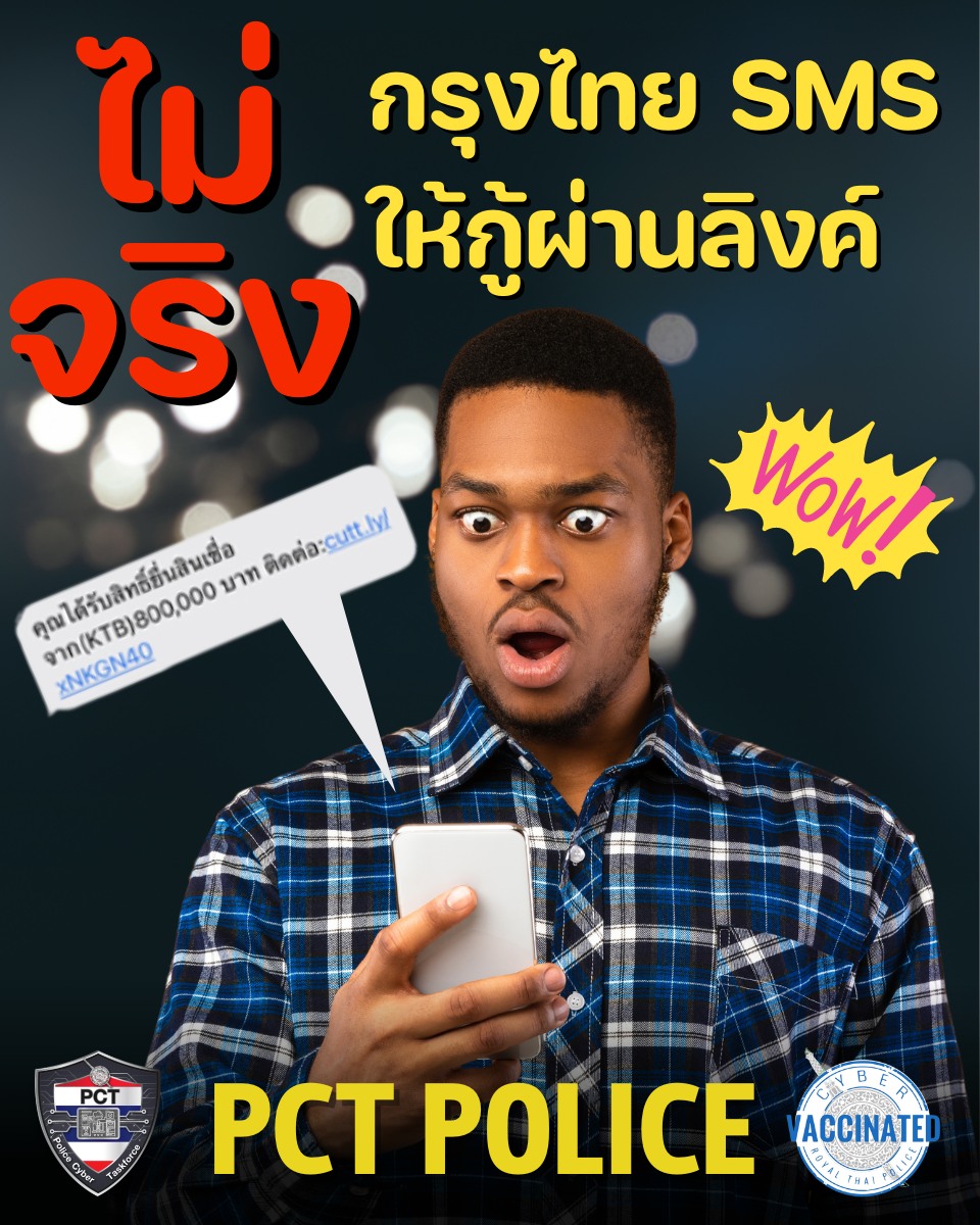 กรุงไทยส่ง SMS ให้กู้เงินผ่านลิงก์ ไม่จริง ระวังจะตกเป็นเหยื่อโจรออนไลน์ อย่าหลงเชื่อ และอย่าแชร์ ถ้