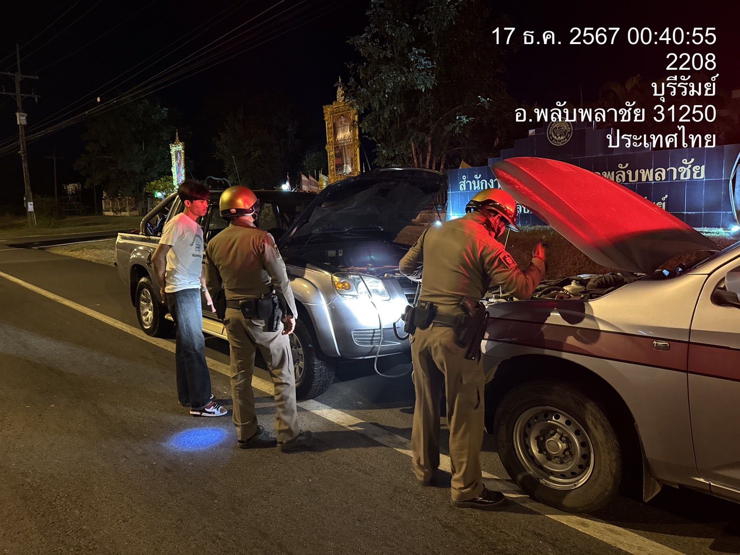 ร.ต.ท.บุญเทียม ปะกาเร ร้อยเวรป้องกันปราบปราม พร้อมสายตรวจรถยนต์/จยย.ได้ดำเนินการต่อพ่วงแบตเตอรี่ ช่ว